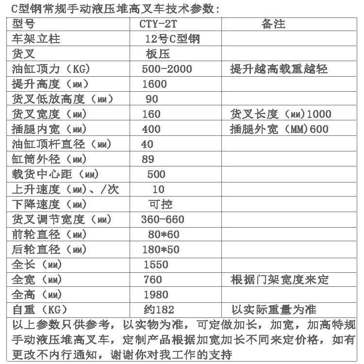 2吨1.6米C型钢手动液压堆高车 CTY2000-2T 板压货叉 门架穿轴叉车